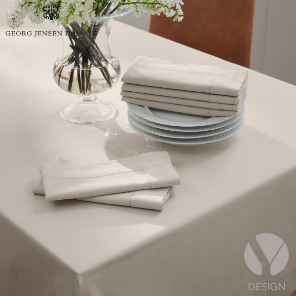 Picot servietter med en elegant hulsømsbort og Georg Jensen Damasks ikoniske logo broderet som en enkel detalje. Picot-serien er lærredsvævet i 55 % hør og 45 % bomuld. Vævningen forener hørens naturlige tekstur med bomuldens blødhed og formstabilitet. Servietterne er certificeret i henhold til OEKO-TEX® STANDARD 100.