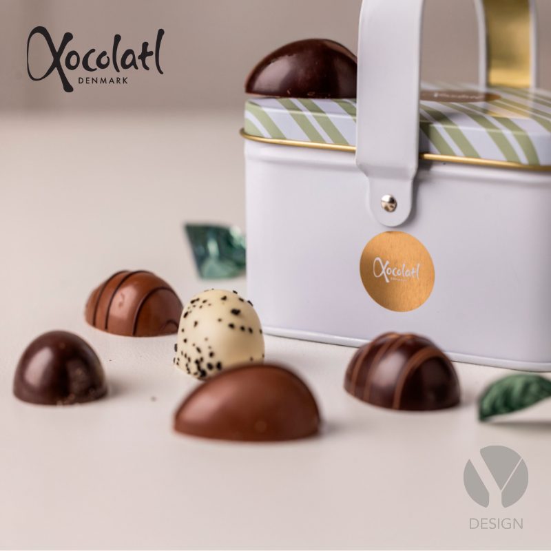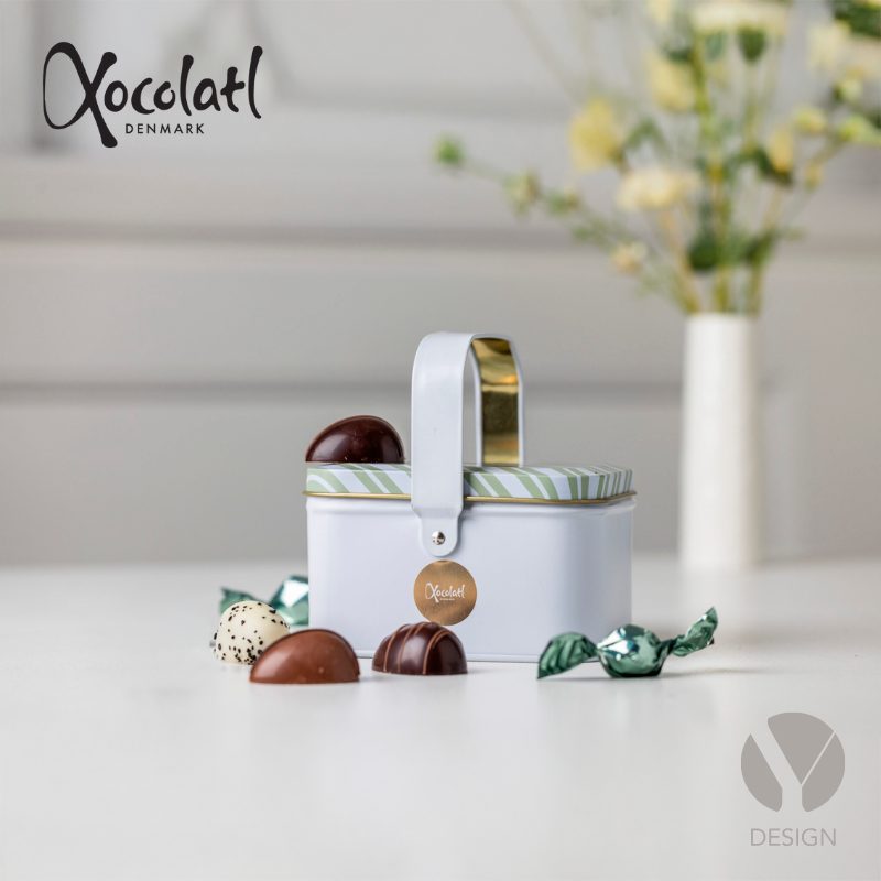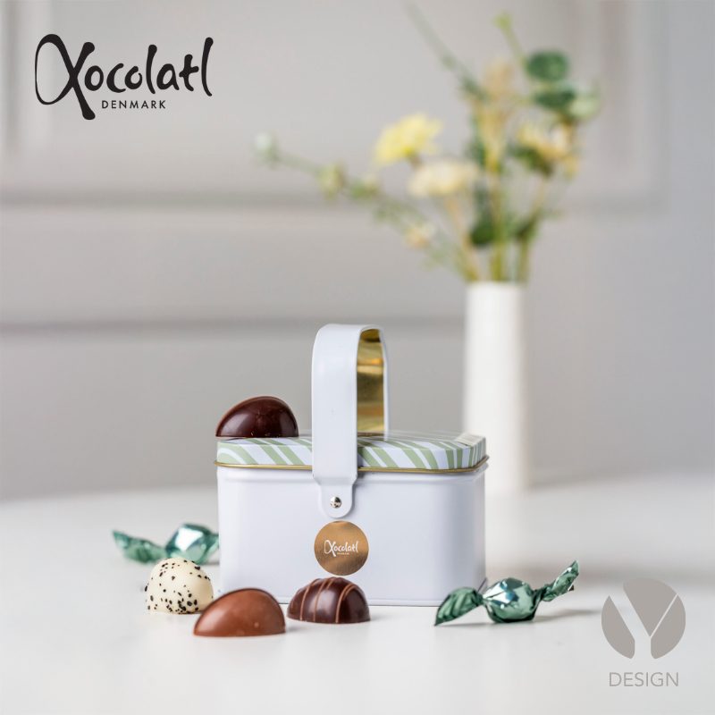 Sød metalkurv med 10 marcipanæg med flere forskellige smagsvarianter som f.eks. ren klassisk marcipan, kokos, citron, solbær og lakrids. Derudover twistpakkede chokoladelakridser.