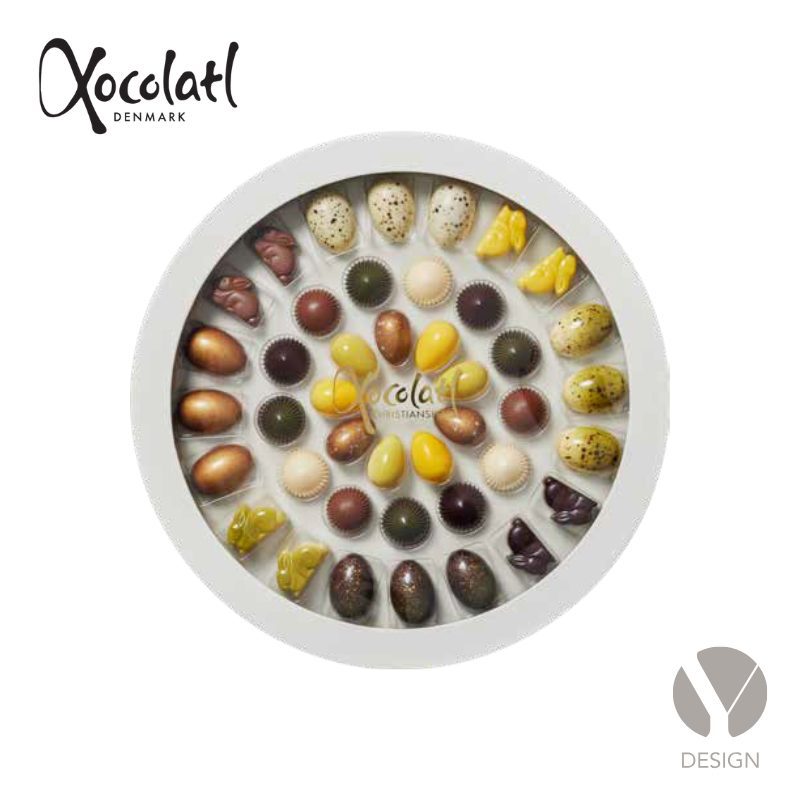 42 fyldte chokolader samlet i en stor smuk rund gaveæske. Spændende smagsvarianter som f.eks. hasselnøddekaramel, flødekaramel, yuzu, kokos, nougat, saltkaramel, lakrids m.m.