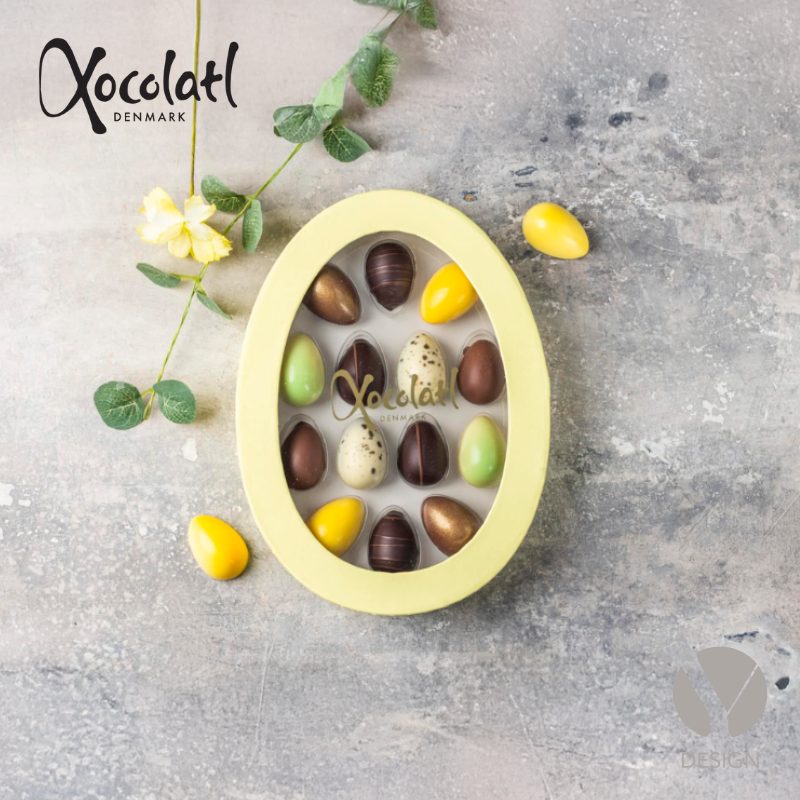 14 fyldte chokolader i en smuk gul gaveæske. Smagsvarianter med klassisk marcipan, lakrids, yuzu, flødekaramel, citron, kokos og solbær.