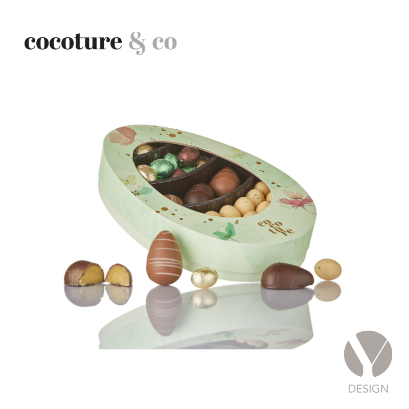 400g 3 x 36g marcipanæg, nye fyldte folieæg, brune og hvide dragéæg og små dragéæg i grøn Cocoture big easter med blomster