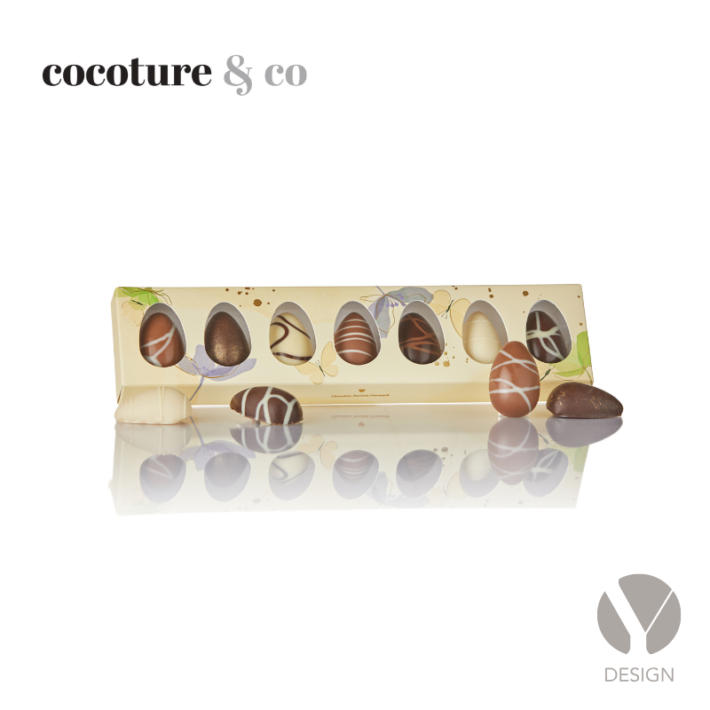 87g mix af 3 x 13g marcipanæg og 4 x fyldte chokoladeæg i gul æske med blomster