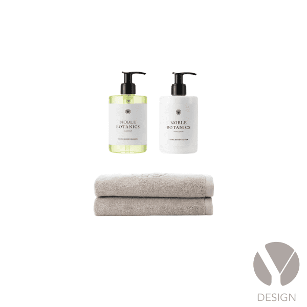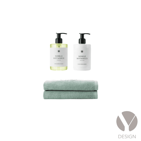 Eksklusivt sæt med jacquardvævede Damask Terry håndklæder i 100 % bomuld og velduftende hudpleje. Håndklæderne fås i farverne Taupe og Sage Green og er certificeret i henhold til OEKO-TEX® STANDARD 100. Noble Botanics hudplejeserien er beriget med fugtgivende og plejende bomuldsekstrakt. Serien er 100 % vegansk, certificeret af The Vegan Society og produceret i Danmark.