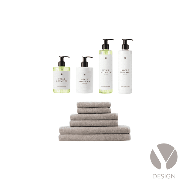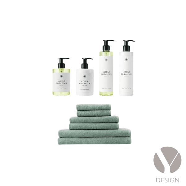 Eksklusivt sæt med jacquardvævede Damask Terry håndklæder i 100 % bomuld og velduftende hudpleje. Håndklæderne fås i farverne Taupe og Sage Green og er certificeret i henhold til OEKO-TEX® STANDARD 100. Noble Botanics hudplejeserien er beriget med fugtgivende og plejende bomuldsekstrakt. Serien er 100 % vegansk, certificeret af The Vegan Society og produceret i Danmark.
