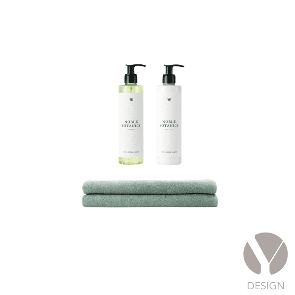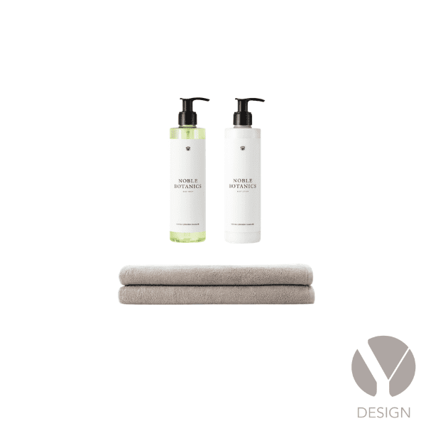 Eksklusivt sæt med jacquardvævede Damask Terry håndklæder i 100 % bomuld og velduftende hudpleje. Håndklæderne fås i farverne Taupe og Sage Green og er certificeret i henhold til OEKO-TEX® STANDARD 100. Noble Botanics hudplejeserien er beriget med fugtgivende og plejende bomuldsekstrakt. Serien er 100 % vegansk, certificeret af The Vegan Society og produceret i Danmark.