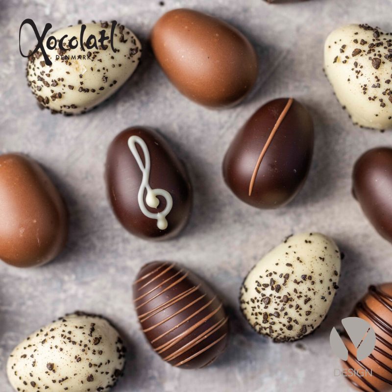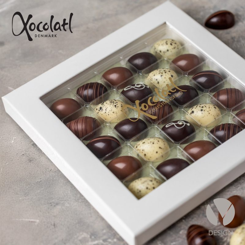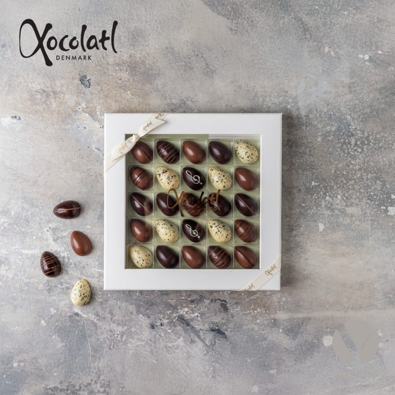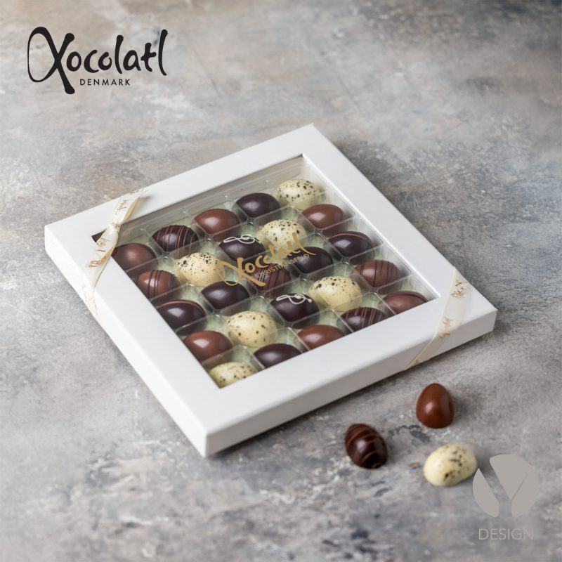 Gaveæske med 25 hånddekorerede marcipanæg overtrukket med enten 70% mørk chokolade mælkechokolade eller hvid chokolade. Forskellige smagsvarianter med klassisk marcipan, lakrids, solbær, citron og kokos.
