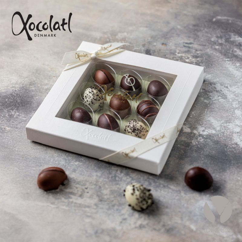 Gaveæske med 9 marcipanæg med forskellige smagsvarianter med kokos, lakrids, citron, solbær og ren klassisk marcipan med mørk chokolade.