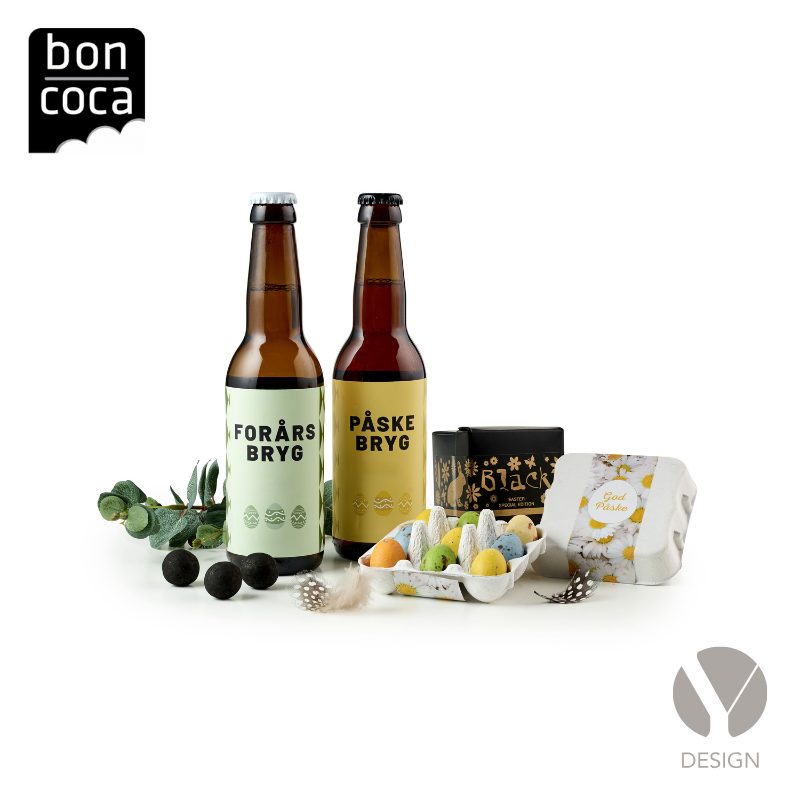 1 fl. Påskebryg 33 cl.; 1 fl. Forårsbryg 33 cl.; 9 stk. Gourmetæg 65 g.; Black Lakrids – Easter Edition 90 g.; Pakket i cellofanpose m/gul sløjfe