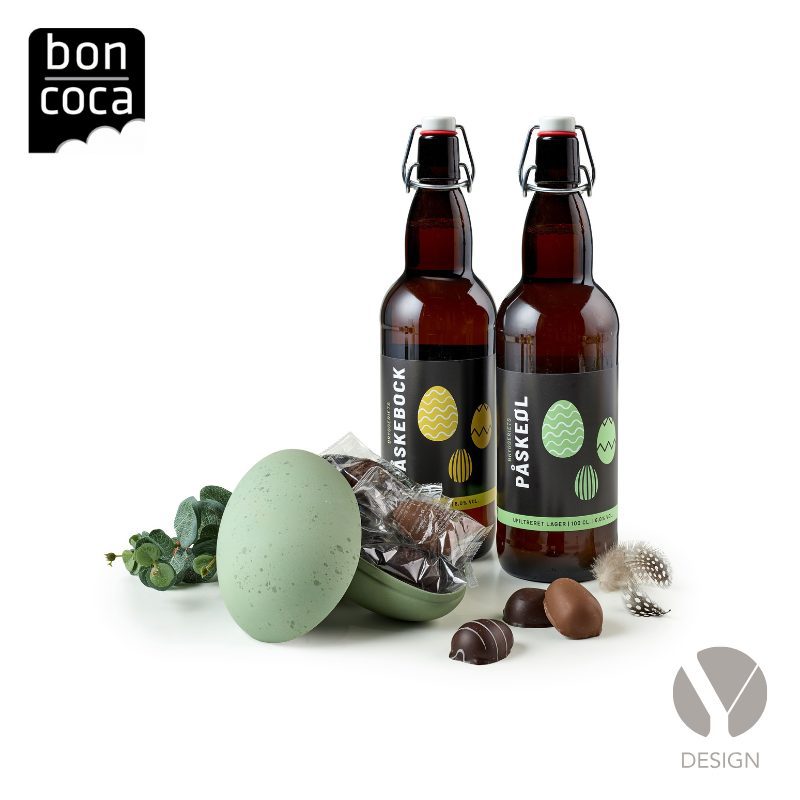 En klassisk og stilfuld påskegave med to fyldige sæsonøl – påskebock og påskeøl – kombineret med et dekorativt metalæg fyldt med marcipanæg. Smukt pakket i en sort stofpose og oplagt som gave til påskehyggen.