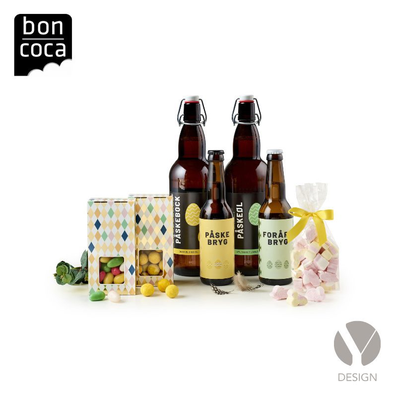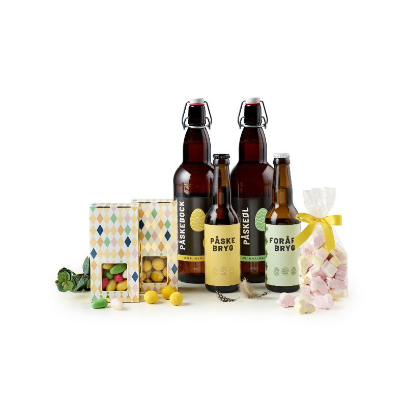 1 fl. Påskebock 100 cl.; 1 fl. Påskeøl 100 cl.; 1 fl. Påskebryg 33 cl.; 1 fl. Forårsbryg 33 cl.; Sukkeræg 90 g.; Lakridskugler m/Hvid chokolade & passion 90 g.; Påskeskum 50 g.; Pakket i sort stofpose
