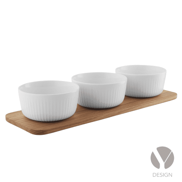 Den elegante Eva Trio Legio Nova-serie kendes på de rene, enkle former og fine riller i porcelænet. Seriens stilrene design sørger for en elegant borddækning både til hverdag og fest.