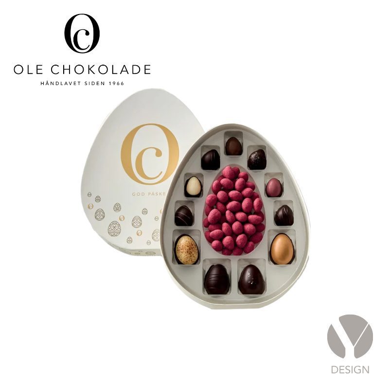 Gaveæsken indeholder 7 delikatesseæg á 10 gr., 4 mesteræg á 30 gr. og 150 gr. hindbærmandler.