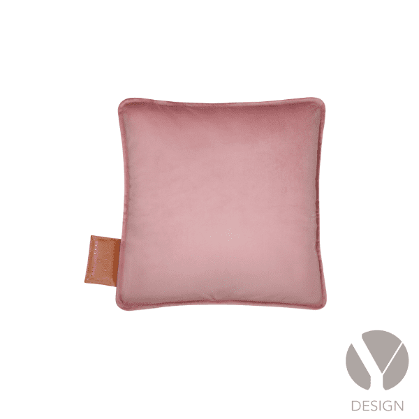 Puden er 45×45 cm og fås i flere farver og materialer. Denne model er i en flot lyserød og passer perfekt til både sofa, seng og kontor.
